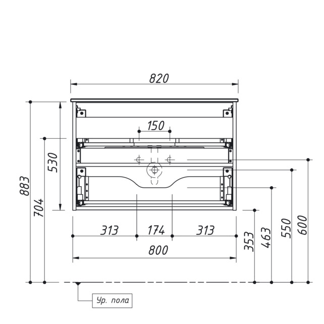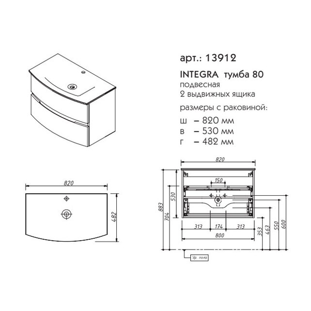 - Габаритные размеры тумба + стеклянная раковина, ш/г/в, в см: 82/ 48,2/ 54,8